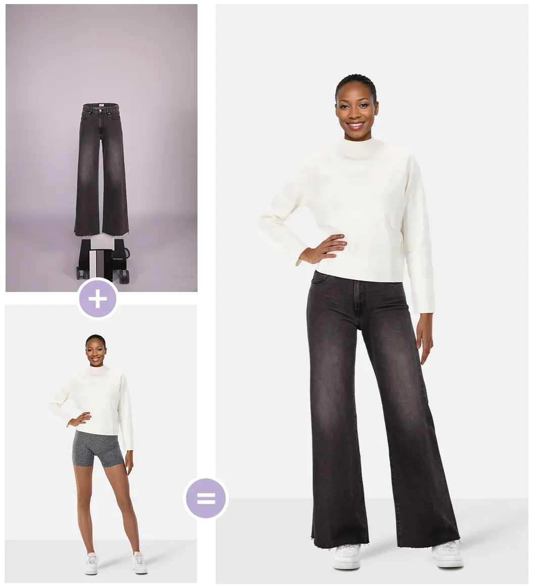 This innovative technology seamlessly merges Virtual Model imagery with standard product shots, creating breathtakingly realistic on-model imagery that truly captivates.